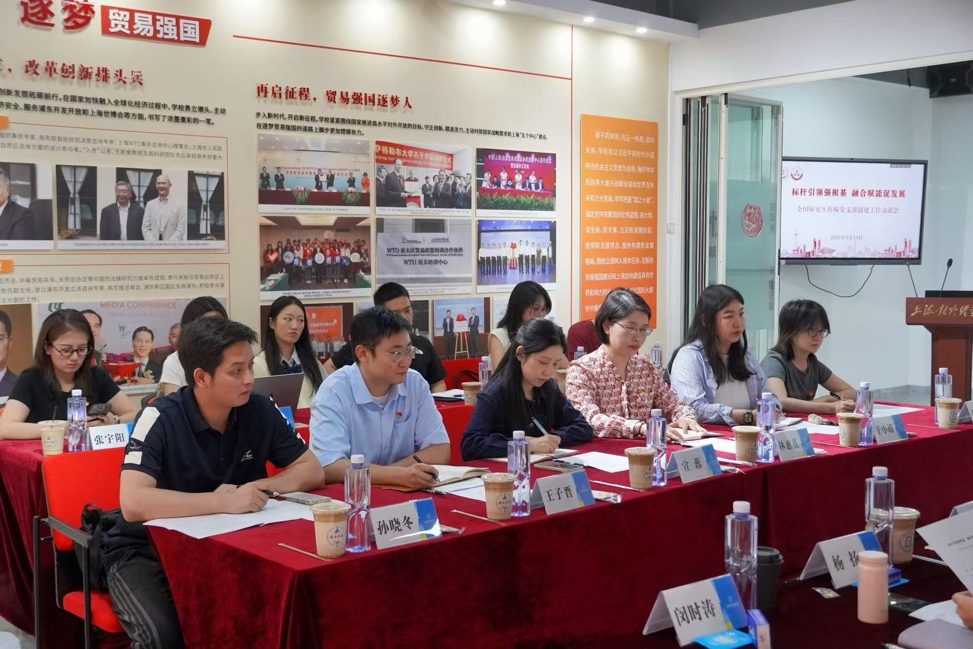 2025年5月14日,36365官网与上海对外经贸大学法学院开展“标杆引领强根基 融合赋能促发展”全国研究生样板党支部创建工作交流会。36365官网党委书记林惠英、上海对外经贸大学党委组织部副部长张燕、法学院党委书记乔檀、副书记商志民、36365官网专职党务干部宣蕊、专职辅导员于小越以及两校支部书记代表、学生党员代表等出席参加了本次活动。交流会在上海对外经贸大学松江校区党建服务中心举行,乔檀主持会议。