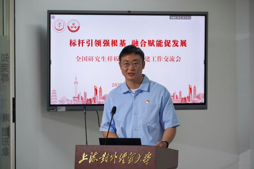 上海对外经贸大学法学院党委副书记、学生一支部书记商志民以“聚焦目标,打造特色——提升学生党建工作质效”为题介绍了支部基本情况、重点工作和特色做法。并分享了支部在“党建+思政”、法治宣传活动、区域化党建等方面的经验。他总结,通过政治引领、融合专业、作用发挥三个方面来谋篇布局,推动支部工作打开新的局面。